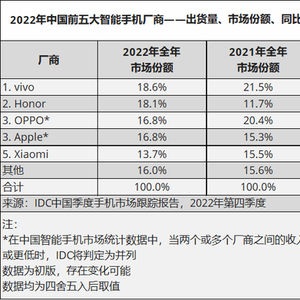 不过在行业一片哀鸿遍野的背景下,荣耀却走出了“微笑曲线”。2022年,荣耀手机市场份额为18.1%,位居第二,出货量同比上涨34.4%,是前五大智能手机厂商中,唯一实现双位数增长的品牌。