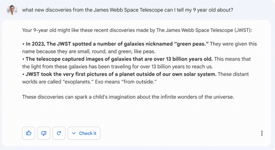 从博文里的图片来看,Bard也是和ChatGPT类似的聊天框形态,能做的事除了简化复杂的主题,比如”向9岁的孩子解释NASA的韦伯望远镜带来的新发现“,还能帮助人们做一些复杂的任务,包括”计划朋友的新生儿派对“、”比较两部奥斯卡提名的电影“和”根据冰箱里的食物给出一些午餐点子”等。