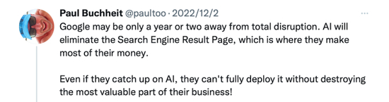 谷歌的第23号员工,Gmail的缔造者保罗·布赫海特在2月1号发推悲观表示,谷歌将会在一两年内被彻底颠覆——当人们的搜索需求能够被封装好的、语义清晰的答案满足,搜索广告将会没有生存余地。而占据全球接近84%搜索市场的谷歌,到现在仍然是一家50%营收直接来自搜索广告的公司。