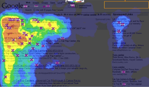 康乃尔大学的研究人员曾经通过眼部追踪实验获得了精确的谷歌搜索结果的用户行为分析。分析结果显示,首条结果获得了 56.38% 的搜索流量,第二条和第三条结果的排名依次降低,但远低于排名第一的结果。