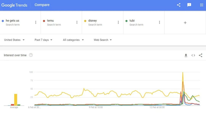 不过,从另外一个角度,这次的广告也确实帮助Temu的品牌出圈。Olivia Moore 分享的另外一张图片则显示,Temu的Google搜索量在广告播放时段确实出现了激增。