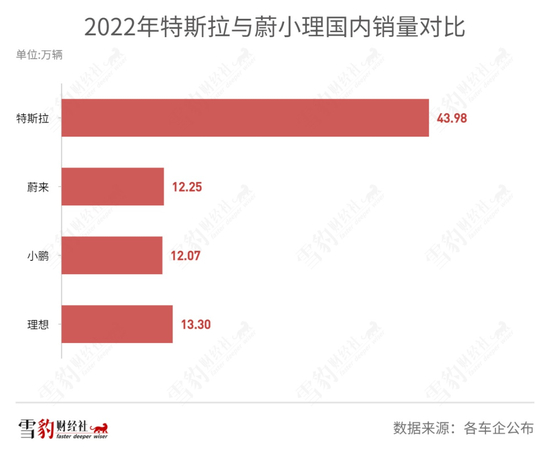 中国电动汽车市场较美国竞争更加激烈,2022年特斯拉在中国销量近44万辆,占新能源汽车市场7.8%份额,但销量仍高于“蔚小理”之和(约37.5万辆)。