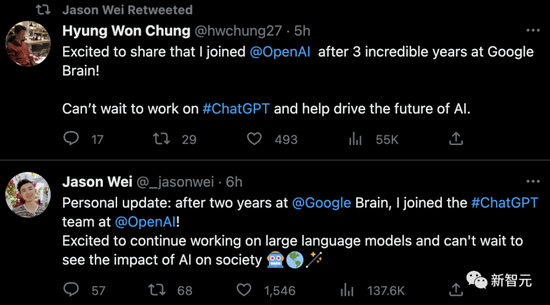 今天,两位前谷歌员工Jason Wei和Hyung Won Chuang仿佛约好了一般,前后脚宣布从谷歌大脑离职、入职OpenAI,还互相转了推。