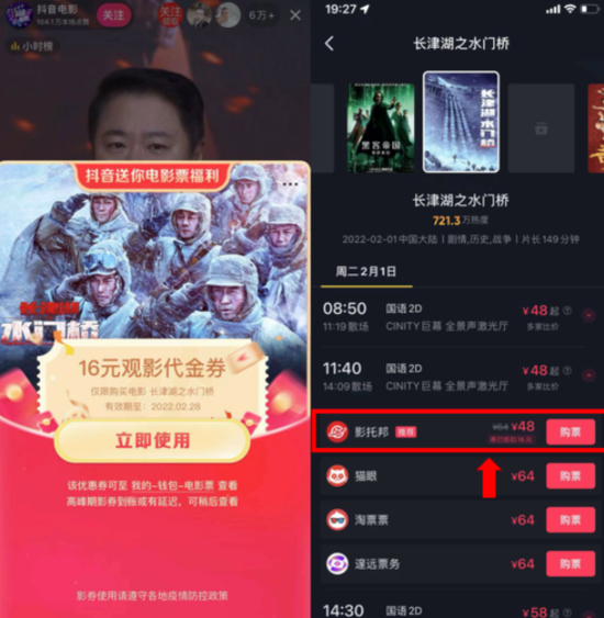 2022年春节档,抖音再次邀请电影主创团队来直播间送福利,当时送出的优惠券为16元。此外,用户还能以5.9折到6.2折购买100~300元的观影券。