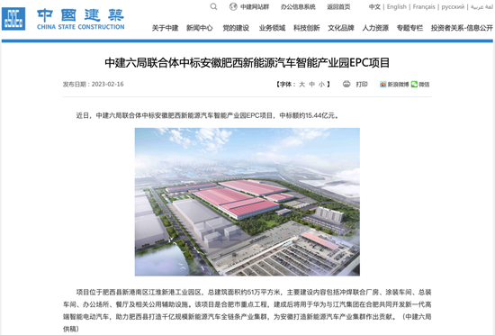 2月16日,中建集团官网发布消息称,中建六局联合体中标安徽肥西新能源汽车智能产业园EPC项目(工程总承包,以下简称“EPC项目”),中标额约15.44亿元。