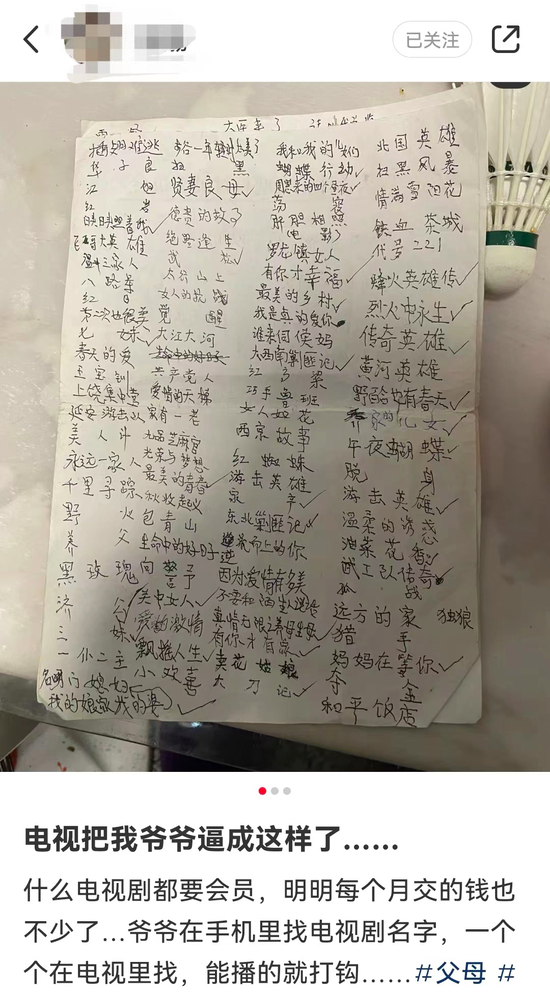 社交平台上,一位用户分享到,智能电视难倒了家里的老人。“什么电视剧都要会员,明明每个月交的钱也不少”,这位用户称,爷爷只好先在手机里找好电视剧名字,一个个摘抄下来,再在电视上确认是否能播,能播放的就打勾。