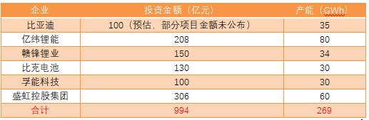 同样在1月,已有多家企业公布了动力、储能电池的扩产计划,投资金额接近千亿元,产能合计269GWh,超过了去年上半年的产量合计(206.4 GWh),几乎覆盖了去年去年的国内动力电池装车量需求(294.6 GWh)。