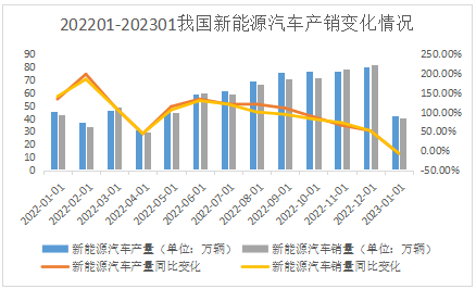 根据中汽协的统计,从去年一月份到今年一月份这13个月里,我国新能源汽车的产销量同比变化逐渐放缓,尤其从去年下半年开始产销量同比月增速变化一路下滑,甚至在八九月份出现了明显的产量大于销量,即供大于求的市场表现。今年1月,更是出现断崖式的增速下跌,也是近两年里首次出现同比月负增长,仅有42.5万辆的产量和40.8万辆的销量。