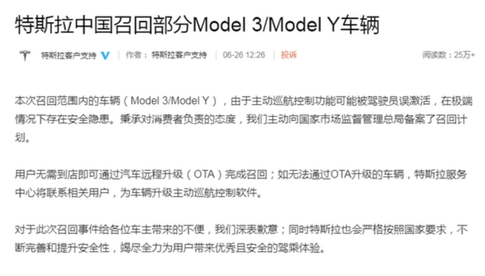 不过不同于传统意义上的召回,特斯拉最近的这次召回是通过软件在线升级(OTA)的形式进行,即不需要将车辆送到特斯拉的售后服务处,远程联网进行软件升级就可以修复车辆缺陷。但此次的召回事件还是让消费者对特斯拉产生了不信任。