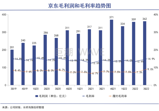 与此同时,京东毛利率持续提升,2022Q3履约后毛利率达到9%,创三年最高水平。而公司管理层解释称,主要原因是减少了用户补贴。