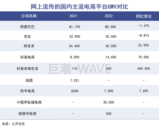 根据分析师和相关公司内部流出的测算数据显示,拼多多2022年GMV预计达到3万亿元或者更高,这一数字已和京东旗鼓相当,而抖音电商加本地生活GMV也接近1.5万亿元。
