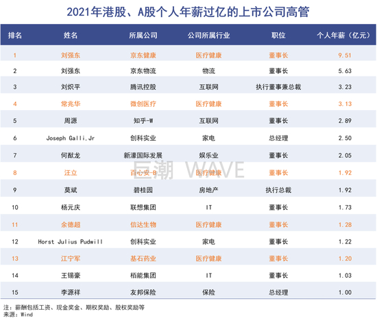 刘强东虽然只在京东集团领取1元年薪,但他仅2021年就在京东健康获取9.51亿薪水(股份支付),在京东物流拿了5.63亿元的报酬,位居全中国上市公司第一人,合计超15亿元。