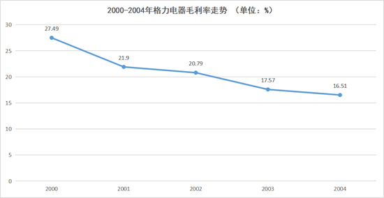 2000-2004年格力电器毛利率走势,数据来源于财报,连线Insight制图