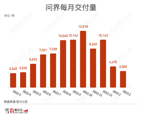 1月13日,问界宣布旗下车型售价下调2.88万~3万元,但以价换量的策略出师不利。1月和2月,问界交付量连续两个月环比下滑,分别为4475辆和3505辆。