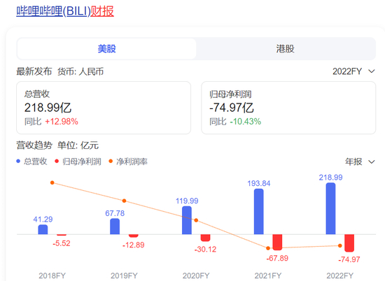 另外,哔哩哔哩在年度净亏损的绝对数量上,也是在不断增多。例如,2019年-2021年,公司净亏损分别为12.89亿、30.12亿、67.89亿,而到了2022年,则是净亏损74.94亿。如果说净亏损数量的增加,是战略性投入,公司快速发展的客观需要,那么随着公司总营业收入的增加,净亏损率应该有所降低,才是企业健康经营的重要参考。