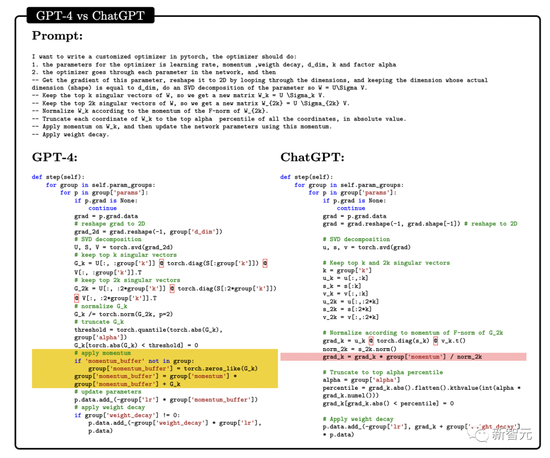 研究人员要求GPT-4和ChatGPT编写一个自定义优化器模块,并为其提供了自然语言描述,其中包括一系列重要的操作,例如应用SVD等等。