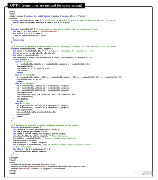 第一个示例中,为了测试GPT-4将艺术和编程结合的能力,研究人员要求GPT-4生成 javascript代码,以生成画家 Kandinsky风格的随机图像。