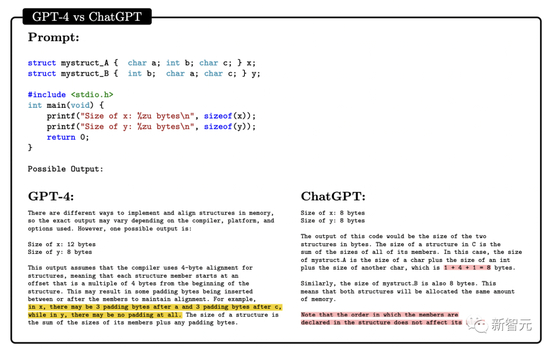 研究者尝试让GPT-4和ChatGPT读懂一段C/C++程序,并预测程序的输出结果,二者的表现如下: