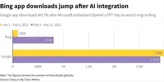 凭借投资Open AI,微软一改在移动生态全军覆没的弱势,在人工智能的新时代里支棱起来。集成Open AI技术的新Bing,近一个月在全球应用市场的下载量暴增8倍。这还是在新Bing处在内测阶段,没有向所有用户开放的情况下。