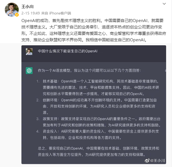 ChatGPT爆火之后,王小川在社交平台上说,Open AI的成功,首先是技术理想主义的胜利。中国需要自己的Open AI,就需要技术理想主义。