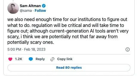 “AI现在还并不那么可怕,但我们应该已经离可怕的AI不远了”。Sam Altman在不久前的推特中说道。