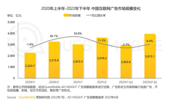 QuestMobile发布的《2022互联网广告市场半年大报告》显示,2022年上半年,中国互联网广告市场规模同比下滑2.3%至2903.6亿元,广告投放品牌数量同比下降38.3%。