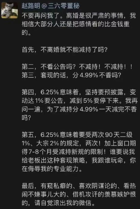 但在如此严肃的问题中,市场还滋生出“假离婚真减持”的猜疑,这让三六零董秘赵路明“大发雷霆”,发朋友圈否认,并称“离婚是很严肃的事情,感情比金钱重要”。