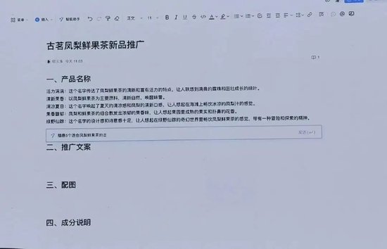举个例子,在现场,钉钉总裁叶军演示了用AI助手斜杠“/”功能,为茶饮新品撰写推广文案;WPS也对外展示了生成旅行度假地选择以及详细安排的方案。