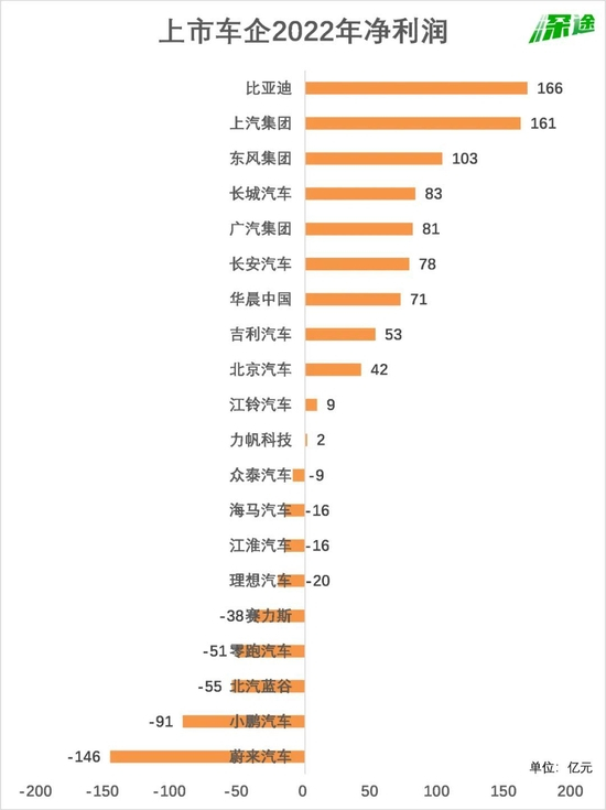 有接近一半的车企(9家),在2022年是亏损的。蔚来、小鹏、理想、零跑这四家上市的新势力,无一例外处于亏损状态,其中蔚来以146亿元的净亏损排第一,小鹏以91亿元排第二。