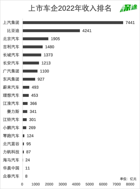 从2022年收入来看,上汽稳坐第一,以7441亿元的总营收遥遥领先;比亚迪以4241亿元排第二;吉利和长城分列第四第五。其中,营收过千亿的车企数量为7家。