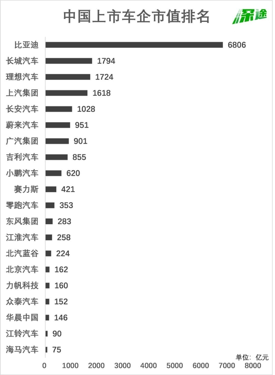 若按市值来看,中国最大的车企是比亚迪,其最新市值6806亿人民币,不仅超过上汽集团,也远超“蔚小理”。