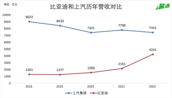 上汽和比亚迪在今年正式展开对决,争夺中国最大车企的头衔。上汽已经连续十多年稳坐全国第一,2018年它营收9022亿元,比另外19家车企的收入加起来都要多。但从那之后,上汽的营收规模就开始走下坡路,2022年降到7441亿元,而比亚迪追赶得很紧,从1000多亿元的营收规模一路涨到4000多亿元,跟上汽的差距逐年缩小。