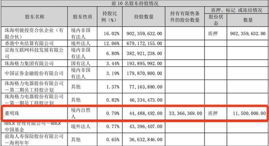 2023年一季度末,董明珠共有1150万股处于质押状态,市值约为4.04亿元,占董明珠所持全部格力电器股份的25.85%。外界有传言称,这与董明珠个人收购银隆新能源汽车股份的借款有关,由于未能及时给付而引发的股份质押。