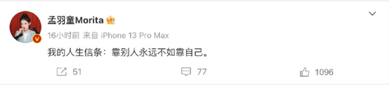 离职前一天,5月9日,孟羽童在微博发文称“靠别人永远不如靠自己。”24岁的孟羽童如是,69岁的董小姐亦如是。
