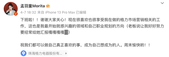 5月11日,孟羽童通过微博确认了自己的离职消息,“跟大家汇报一下,我已经从格力离开,顺利毕业。无论是我还是大家,经历这样一个人生变动,都没必要把它当成消极的事情。它只是我们人生某一个阶段的选择而已。”下一阶段,她准备继续读书,然后申请研究生。