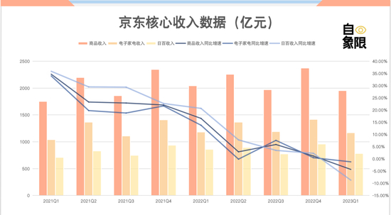 尤其是一个重要的指标,今年一季度,京东商品销售收入为1955.64亿元,同比减少4.33%,环比下降17.7%,这是该指标自有数据以来首次季度下滑。