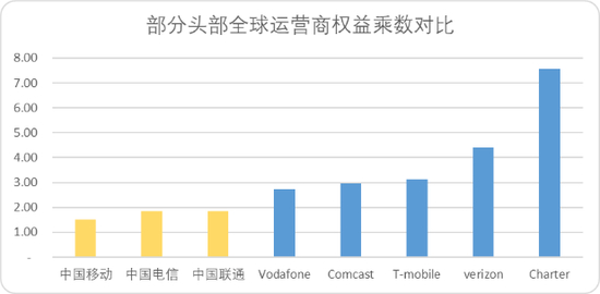 较低的净资产收益率直观带来的是估值的影响,按照欧美传统估值体系,中国移动、中国电信和联通的PB(市净率)1.72x,1.38x,1.11x。而全球头部的运营商平均PB为1.84x——这种差值还是在年初以来运营商持续增长的估值修复下。