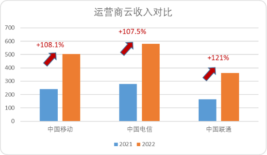 最主要的是,云计算产业带来的回报是真的丰厚,2022财报期是服务商云收入的集中爆发期。三大运营商的运营收增速均突破了100%,其中电信云和移动云的营业收入突破了500亿级别。