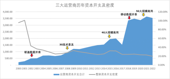 图:三大运营商历年资本开支及密度,来源:锦缎研究院