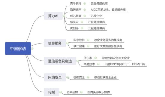 除了整体的资本开支偏向算力网络建设外,移动、电信及联通近年来通过不同的投资主体,产业基金也投资了许多企业。中国移动对于云计算、信息服务的投资偏好大,从芯片、产品软件和云厂商都有涉猎,电信主要聚焦数字产业,同样也对云计算服务有投资。联通的投资面较窄,主要是和成熟企业合资成立算力和数字产业前沿的新公司。
