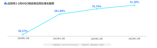 而从脉脉发布的《AIGC⼈才趋势报告》中可以看出,自Open AI推出的2021年以来,对于AIGC相关的人才争夺就已经开始了。2021年1-2月,AIGC相关岗位招聘同比上升281.88%,而后的2022年和今年的1-2月,招聘数量分别保持了76.74%和31.3%的同比增幅。