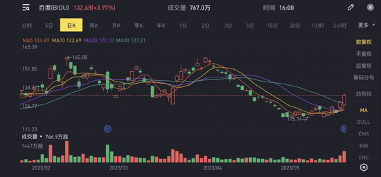 在在线营销营收反弹的带动下,百度本季度营收和盈利都超过预期。在此影响下,百度股价保持增长,财报发布后的5月17日,百度美股股价报收132.68美元/股,微涨3.97%。