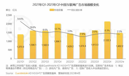 从QuestMobile发布的数据可以看到,2021年第一季度,中国互联网广告市场规模同比增长了54.6%。但此后,整个市场就进入了缓慢增长的阶段。到了2022年,整体市场增速基本在个位数的水平,且第二季度也出现了7.6%的负增长。
