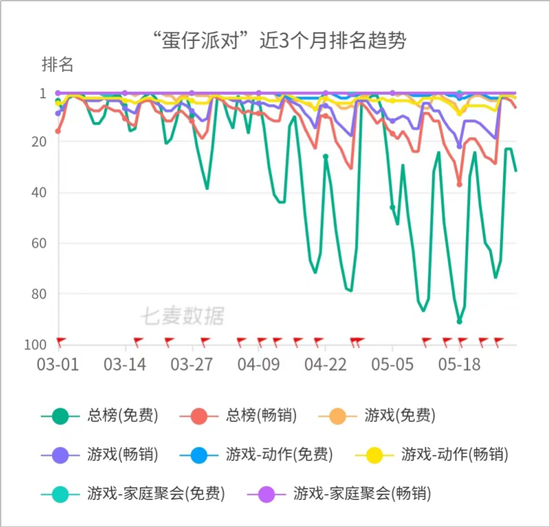 根据七麦数据显示,《蛋仔派对》从4月起呈现下滑趋势,截止5月18日,一度排在游戏免费榜的第9位。