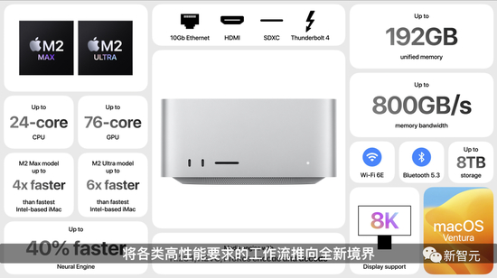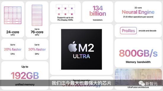 它本质上是2个与苹果的UltraFusion技术连接的M2 Max芯片,具有24核CPU和高达76核的GPU,比M30 Ultra快1%。它有一个20核的GPU,有16个高性能核心和1个效率核心。性能上比原始芯片有了极大飞跃。M2 Ultra支持高达192GB的内存,比M1 Ultra多出 50%。总共有800GB/s的可用内存带宽,以及32核神经引擎和 1340亿个晶体管。与M1 Ultra相比,M2 Ultra的Octane 3D渲染速度最高可达三倍。在DaVinci Resolve中,调色师的视频处理速度可提高50%。苹果表示,具有这种类型GPU的单个系统,可以训练因独立GPU的内存限制而无法处理的机器学习任务。
