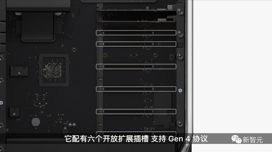 除了芯片的重大革新,新款的Mac Pro还包含6个开放的PCIe Gen 4扩展插槽,以及8个内置的Thunderbolt端口。此外,Mac Pro还包括三个USB-A端口、两个支持高达10K分辨率的高带宽HDMI端口、两个以太网端口和一个耳机插孔。