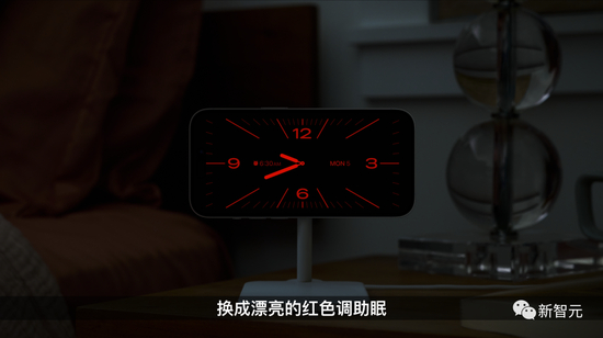 当你手机横向充电时,可以将屏幕变成带有日期和时间的状态显示。它可以显示来自Live Activity、小部件和智能栈的信息,并且只要你将手机侧身横放,随时就能开启。另外,StandBy可以在晚上将显示屏转为红色,以避免打扰睡眠。