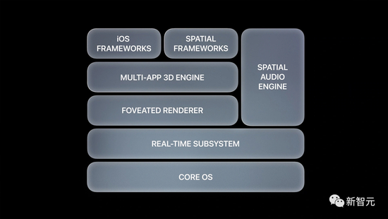 如前面所提到的,Vision Pro的交互方式包括眼睛、手势和声音。正是visionOS才得以驾驭这些交互,并在工作、看电影、游戏等场景下,满足现实的扩展需求。VisionOS与MacOS和iOS共享核心模块,不一样的是,Vision Pro上增加了一个用于处理交互式视觉效果的‘实时执行引擎’。还有首个多APP专用的3D引擎。