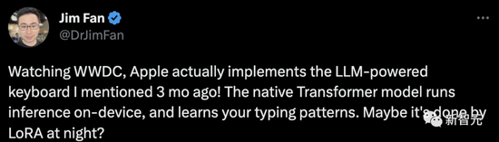 最最重要的是,苹果这次把键盘,直接智能化新升级。几个月前,英伟达首席科学家Jim Fan在推特上分享了自己的这一‘天才创意’,甚至得到了马斯克的转发,称‘这是有价值的idea’。苹果这就给你实现了不是。Jim Fan今天还激动地转推表示,看了WWDC,苹果真的实现了我3个月前提到的LLM驱动的键盘!原生的Transformer模型在设备上运行推理,并学习你的打字模式。也许这是由LoRA在晚上完成的?