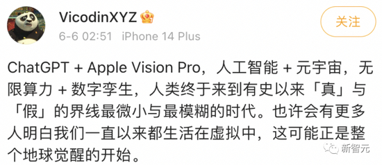 库克现场表示,Vision Pro预计在2024年年初发布。那么,它会成为下一个十年的新‘iPhone’吗?看完这届发布会的网友,感慨颇多。ChatGPT + Apple Vision Pro,人工智能 + 元宇宙,无限算力 + 数字孪生,人类终于来到有史以来‘真’与‘假’的界线最微小与最模糊的时代。也许会有更多人明白我们一直以来都生活在虚拟中,这可能正是整个地球觉醒的开始。